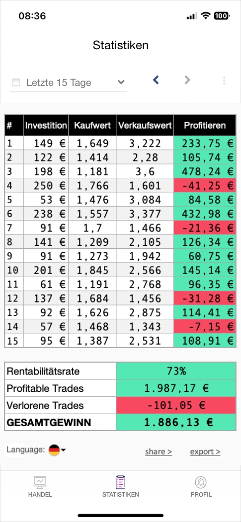 Um eine realistischere Leistung dieser App vorzuführen, zeigen wir Ihnen die Ergebnisse der letzten 15 Tage, als einer unserer Kollegen die App nutzte.